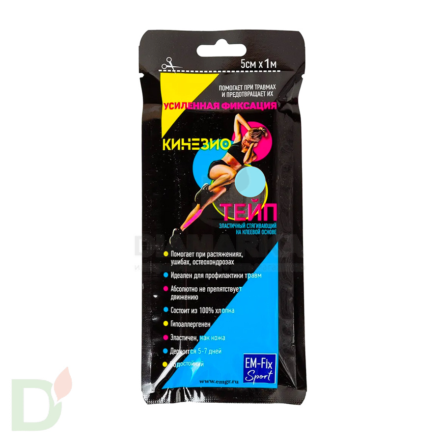 Кинезиотейп EM-Fix Sport стягивающий идеален для дополнительной фиксации канюль, сенсоров и трансмиттеров систем непрерывного мониторинга глюкозы крови, подов помпы ОмниПод. <br> <h2>Данный кинезиотейп сделан из 100-% хлопка</h2> ...а состав клеевой основы имеет гипоаллергенные свойства. Это значит, что кожа под тейпом будет дышать - раздражений и покраснений можно не бояться!<br> <h2>Преимущества тейпа EM-Fix Sport усиленной фиксации</h2> <ul> <li>позволяет коже дышать</li> <li> водостойкость</li> <li> эластичность</li> <li> гипоаллергенность</li> <li> стойкость до 7-ми дней!</li> </ul> <br> <br> <br> Основное предназначение тейпа - снятие боли и напряжения в мышцах и суставах при травмах, ушибах и растяжениях. Тейпирование применяется при остеохондрозе, а также может использоваться для профилактики травм.<br> <h2>Состав тейпа EM-Fix Sport</h2> Материал: 100 % хлопковая эластичная ткань.<br> Связующий материал: полиакриловый клейкий гель.<br> Несущий материал: бумага с силиконовым покрытием.<br> <b>Производитель: Испания</b>