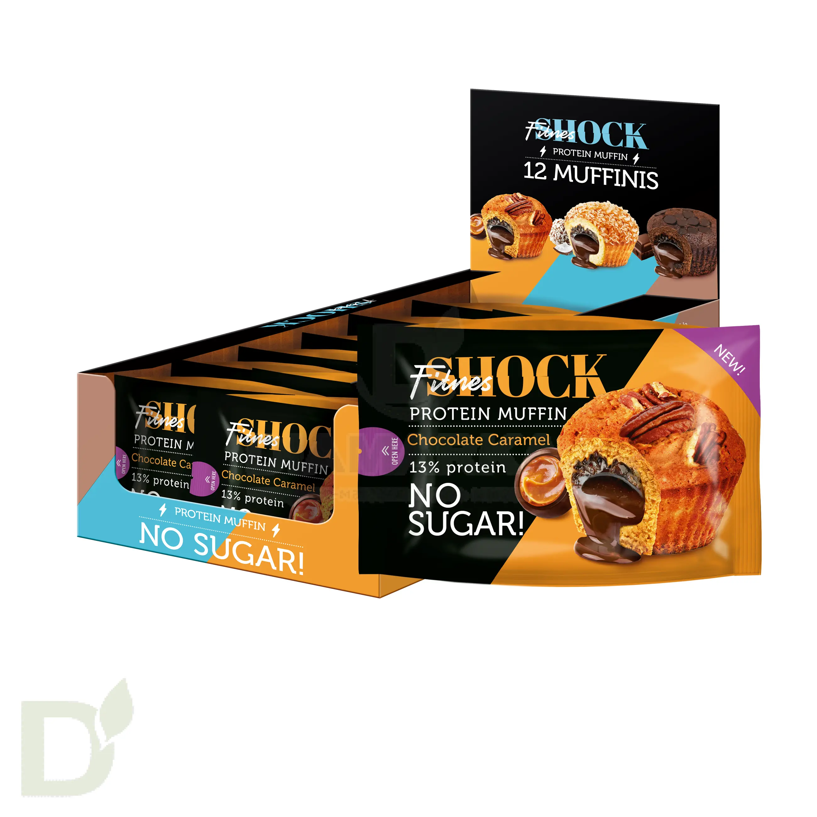 <h2>Правильные маффины с начинкой без сахара и муки от FitnesShock</h2> FitnesShock - десерты на основе протеина и пищевых волокон для тех, кто придерживается ЗОЖа и ПП, диеты, контролирует потребление сахара. Эти вкусняшки понравятся тем, кто часто вынужден перекусывать на ходу. Порция десерта вполне может заменить полноценный перекус, ведь эти сладости содержат много белка, который дает длительное чувство сытости.<br> <br> Маффины ФитнесШок - это вкусный, рассыпчатый и сытный десерт к чаю, кофе и вообще просто так :) Идеальное сочетание воздушного, мягкого, несухого маффина, большого количества нежнейшей начинки и посыпки, которая добавляет пикантности (стружка кокоса / орешки / шоколад)! Десерт на 12% состоит из легкоусвояемого белка и на 15% - из необходимых ЖКТ пищевых волокон. Он не содержит сахара и пшеничной муки высшего сорта.<br> <br> Количество углеводов в маффинах ФитнесШок в 3-4 раза меньше, чем в классическом аналоге! Что важно: в реальности маффины точно такие же, как на картинке. Вы точно не разочаруетесь, когда откроете упаковку, увидите десерт и почувствуете его аромат.<br> <br> Вес 50 грамм<br> <br> <h3>Состав маффинов</h3> Начинка (кокосовое масло, изомальтоолигосахарид (пищевые волокна), какао-порошок, сыворотка сухая молочная деминерализованная, порошок плодов рожкового дерева, молоко сухое обезжиренное, соевый лецитин (эмульгатор), стевиазид (подсластитель), ваниль), вода питьевая, кокосовое масло, полидекстроза (пищевые волокна), эритритол (подсластитель), отруби овсяные, смесь белков ( концентрат молочного белка, концентрат сывороточного белка, яичный белок), мука миндальная, молоко сухое обезжиренное, шоколад , кокосовая стружка, пекан<br> <br> Содержит менее 2%: Глицерин (влагоудерживающий агент), подсолнечный лецитин (эмульгатор), соль розовая гималайская, сода пищевая (регулятор кислотности), сорбат калия (консервант), лимонная кислота (регулятор кислотности), натуральный экстракт какао-бобов, ароматизатор натуральный «Кокос», ароматизатор «Карамель»<br> <h3>Пищевая и энергетическая ценность на порцию / 50 гр</h3> белки 6,5<br> жиры 16,5<br> углеводы 6,4<br> клетчатка 6,5<br> ккал 213<br>