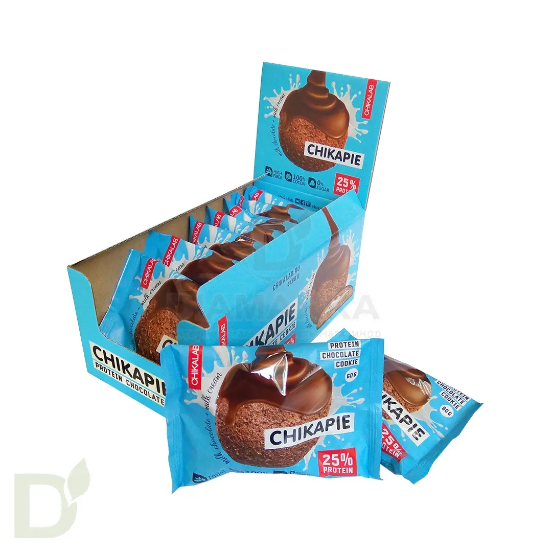 <h2>Не печенье, а настоящий шокопай</h2> Посудите сами: Chikapie - это хрустящее протеиновое печенье, внутри которого нежнейшая шоколадно-протеиновая  начинка, а сверху все это покрыто глазурью из молочного шоколада без сахара! Такого в ассортименте нашего интернет-магазина еще не было!<br> <h2>В основе печенья Chikapie - молочный протеин</h2> Он надолго дарит чувство сытости, а также имеет более низкий гликемический индекс, нежели мука. Именно поэтому печенье Чикалаб отлично подходит для перекуса, или когда времени на прием пищи нет, а кушать хочется.<br> <h2>В одном печенье 3,5 грамм углеводов</h2> Это ничтожно мало, если учесть, что обычные печеньки вытягивают минимум на 1ХЕ на штуку, а то и больше!<br> <h2>Печенье обогащено клетчаткой</h2> Это еще один здоровенный плюс в пользу печенья Чикалаб. Пищевое волокно полезно для здоровья ЖКТ, а также позволяет снизить ГИ продукта.<br> <h2>Состав продукта</h2> белки молочные (концентрат сывороточного белка, концентрат молочного белка), водорастворимые волокна кукурузы, паста шоколадная с фундуком (фундук, водорастворимые волокна кукурузы, изолят сывороточного белка, кокосовое масло, какао-порошок натуральный, эмульгатор - соевый лецитин, ароматизаторы натуральные, антиокислитель (аскорбиновая кислота), подсластитель - сукралоза), молочный шоколад (водорастворимые волокна кукурузы, какао масло, какао тертое, молоко сухое обезжиренное, эмульгатор - соевый лецитин, ароматизаторы натуральные, подсластитель - сукралоза), масло растительное, вода, отруби овсяные, эритрит, кокосовая стружка, продукты яичные (меланж яичный), соль, ароматизаторы натуральные, гидрокарбонат натрия(сода пищевая), регулятор кислотности - лимонная кислота, эмульгатор(соевый лецитин), антиокислитель (аскорбиновая кислота), подсластитель - сукралоза, консервант (сорбат калия).<br> <h2>Пищевая ценность на 1 печенье (60 грамм) </h2> белок - 15; жиры - 13,1; углеводы - 3,5; пищевые волокна - 12; энергетическая ценность - 216 Ккал. <h2></h2>